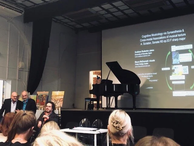 Public Outreach Concerts: Dr. Svetlana Rudenko is a researcher and concert pianist who performs in concert with accompanying visuals, demonstrating how sound and music can be perceived with other senses, including visual, tactile, potentially aromas, and even taste. Awareness of sensory experiences elicited by music broadens our understanding of the processes of imagery, mind, and consciousness. Some of the performances include a Synaesthesia Concert in Maynooth University, 2020; a Music & Consciousness event in University College Dublin, 2020 (both postponed due to Covid-19), Cognitive Musicology via Synaesthesia and Cross-Modal Associations at the BNA Festival of Neuroscience in Dublin, April 2019, and at the IASAS Synaesthesia conference Moscow, October 2019. Collaborations with visual artists Maura McDonnell, Timothy Layden, Ninghui Xiong, Sofia Areal, Geri Hahn, Ann le Pore, and others, have pushed the boundaries of how audio-visual art could be assistive to classical music analysis. Some performances were Svetlana’s improvisations on Art, translating visual experiences into the musical genre. These projects have the potential of developing into AR digital environments for therapeutic purposes, and potentially the prevention or reduction of dementia via the stimulation of brain plasticity mechanisms.